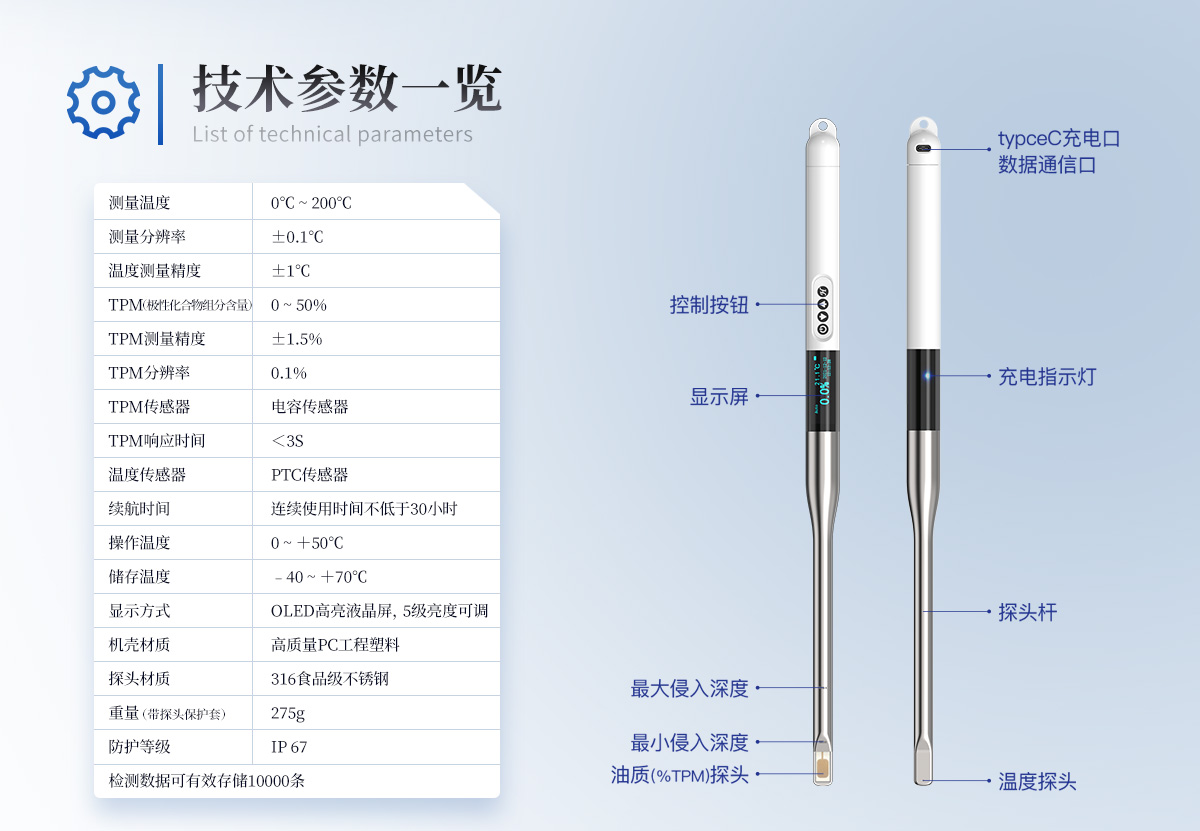 食用油脂是人們攝取能量和營養(yǎng)的重要來源,是加工食品的重要原料。油炸食品以其特有風(fēng)味廣受消費(fèi)者喜歡。用于煎炸的食用油在高溫煎炸過程中發(fā)生一系列的物理、化學(xué)變化,這些變化會(huì)生成對(duì)身體健康有害的物質(zhì)。目前,煎炸食用油的傳統(tǒng)檢測(cè)方法多為化學(xué)方法,這些方法必須在實(shí)驗(yàn)室內(nèi)由專業(yè)人員操作,費(fèi)時(shí)費(fèi)力,化學(xué)試劑的使用可能會(huì)傷害檢測(cè)人員健康,且化學(xué)廢劑污染了環(huán)境。YT-SYP是一種快速,安全,**食用油品質(zhì)檢測(cè)儀,能夠快速檢測(cè)食用油中的極性化合物組分含量。本產(chǎn)品能夠在油溫較高的環(huán)境下使用,適用于各種煎炸的食用油品質(zhì)檢驗(yàn)。